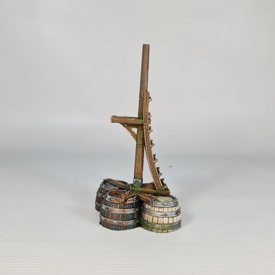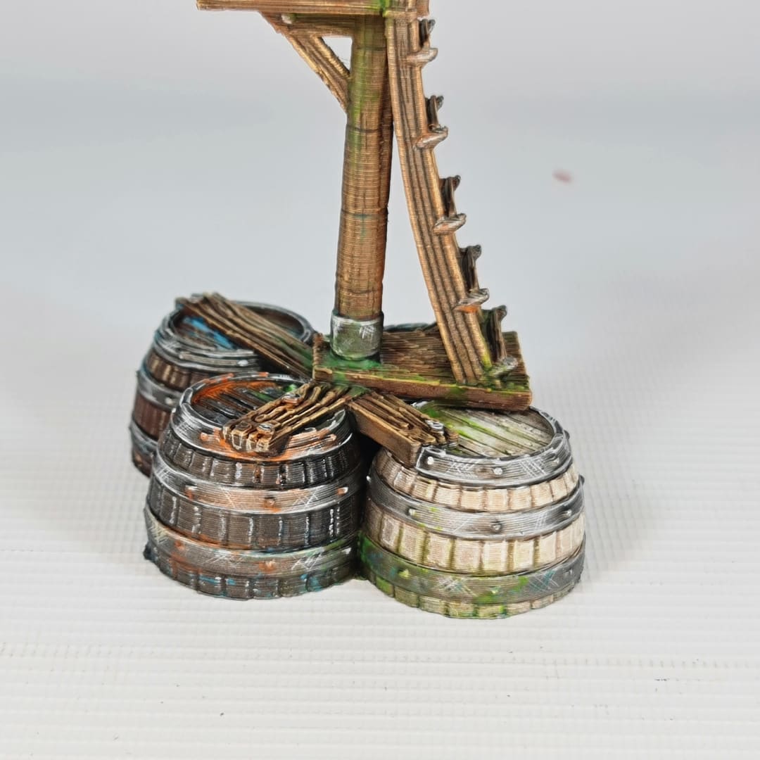 The model features hyper-realistic textures, from the salt-worn wood grain of the mast to the rusted iron hoops of the watertight barrels. Expertly scaled for 28mm and 32mm miniatures, it is a perfect addition to any naval skirmish, pirate raid, or harbor defense scenario.