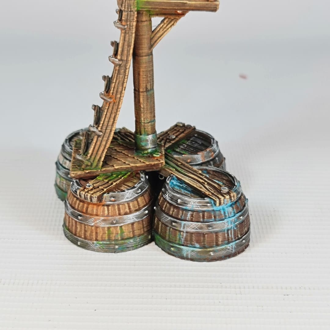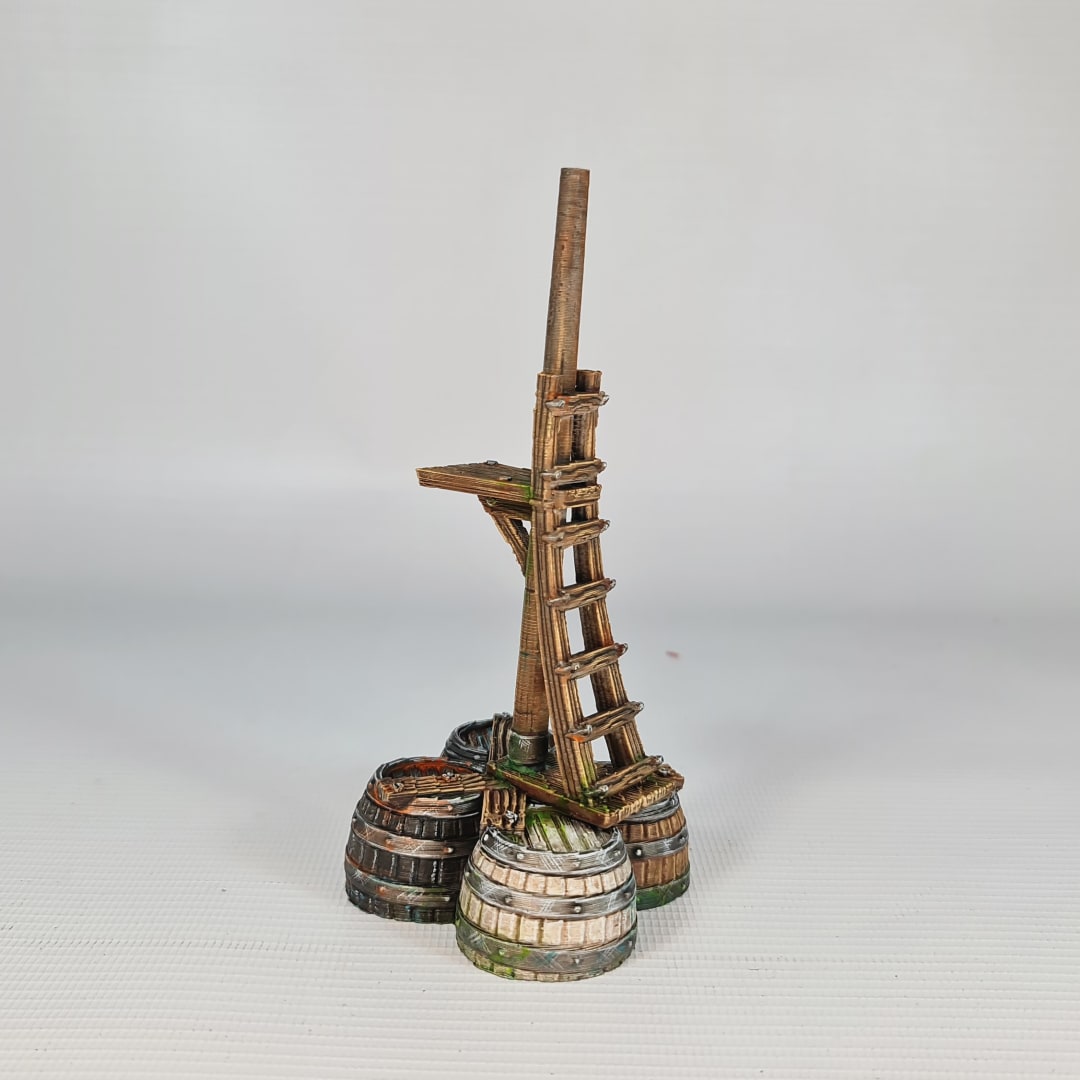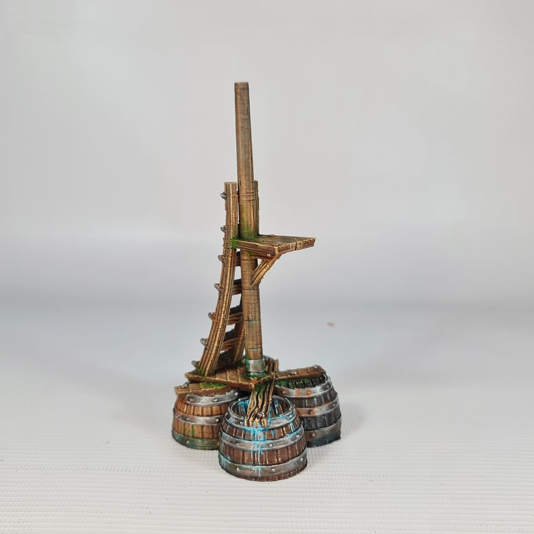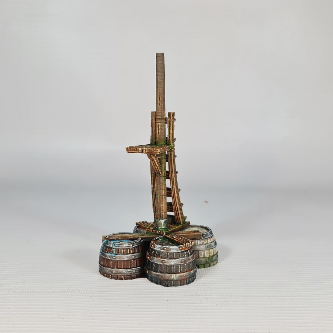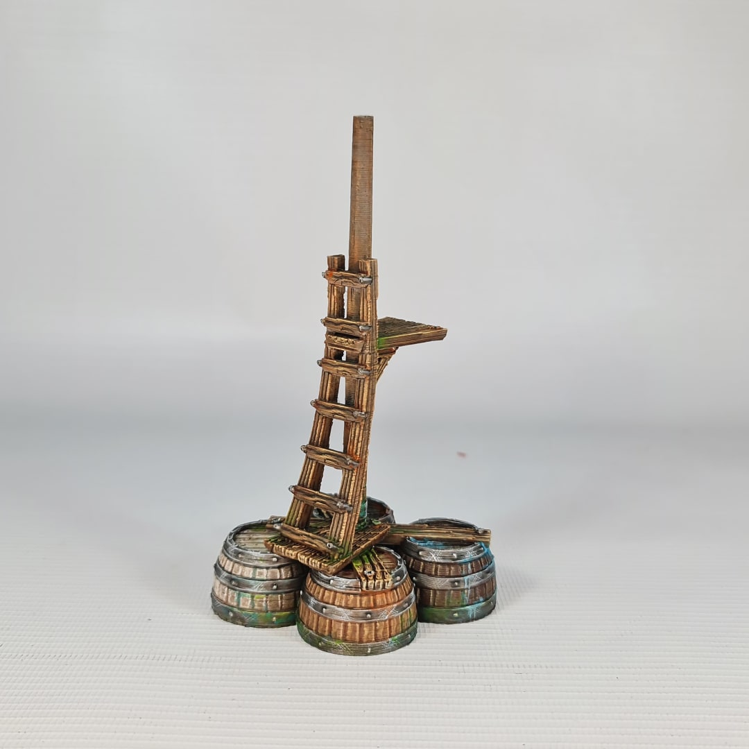 This digital STL file allows you to 3D print the Bobbing Horse, a highly detailed maritime watchpost for tabletop gaming. Far from a static land structure, this model represents a “water horse”—an improvised buoy designed to bob with the swell while a scout climbs the mast to scan the waves. The tripod of reinforced barrels provides the buoyancy needed to support a vertical mast and observation platform, creating a “crow’s nest” in the middle of the open water.