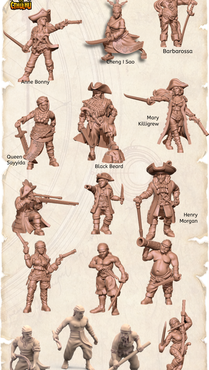 A total of 16 pirates miniatures from Pirates Vs Cthulhu project.