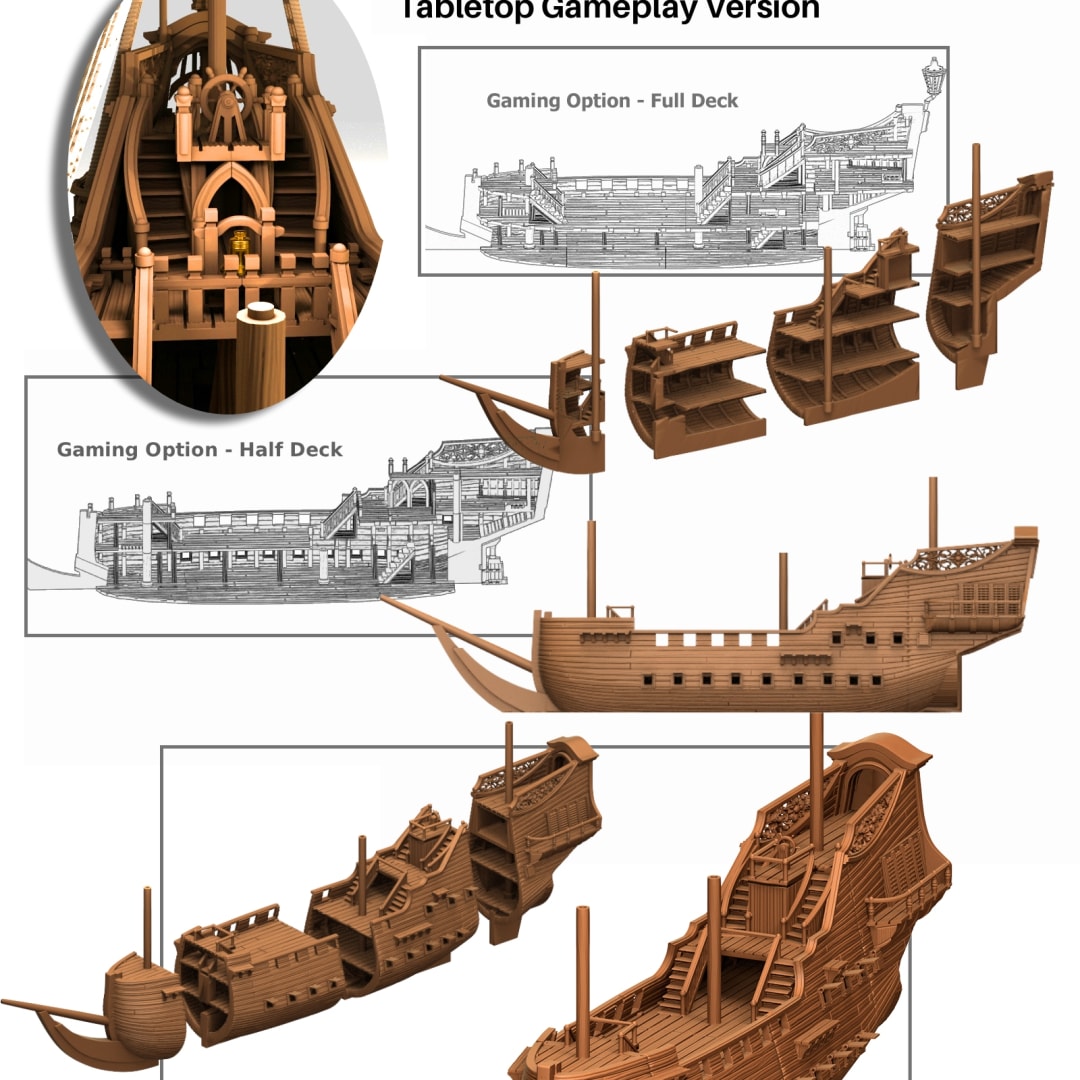 Unleash naval warfare on your tabletop with the Queen Anne’s Revenge, a masterfully crafted 3D printable galleon. This multi-part model is engineered for exceptional gameplay, featuring a fully modular design that allows you to separate each deck. This gives you unrestricted access to the interior, making it perfect for moving miniatures during intense RPG encounters or tactical wargames. The model boasts incredible detail, with realistic wood grain textures, ornate carvings, and accurately scaled features that will look stunning on your table. Designed for the popular 28mm/32mm scale, this ship is compatible with most tabletop gaming systems. It is optimized for both FDM and Resin 3D printers; the main hull sections are designed to be printed support-free on FDM machines, while finer details will shine with resin printing.